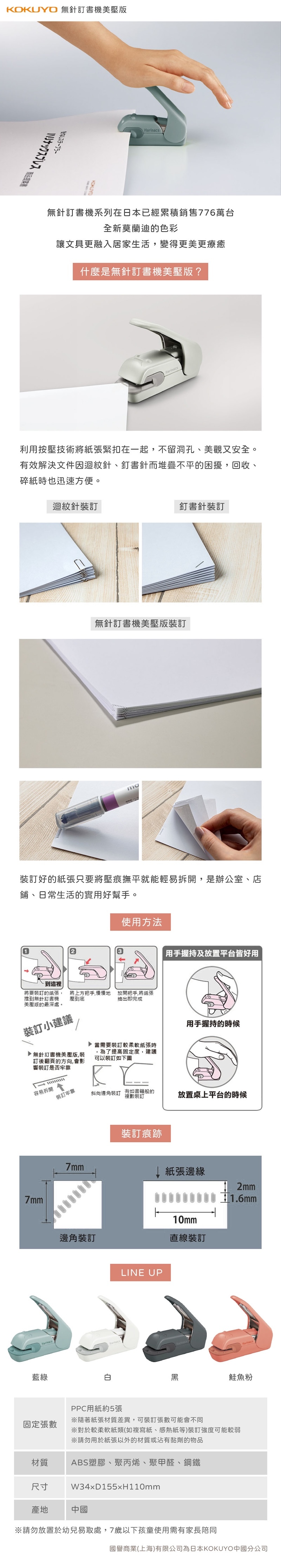 規格:無須釘書針,共可訂5張影印用紙(**如用其他紙張如複寫紙較軟紙質,裝訂程度會減弱)