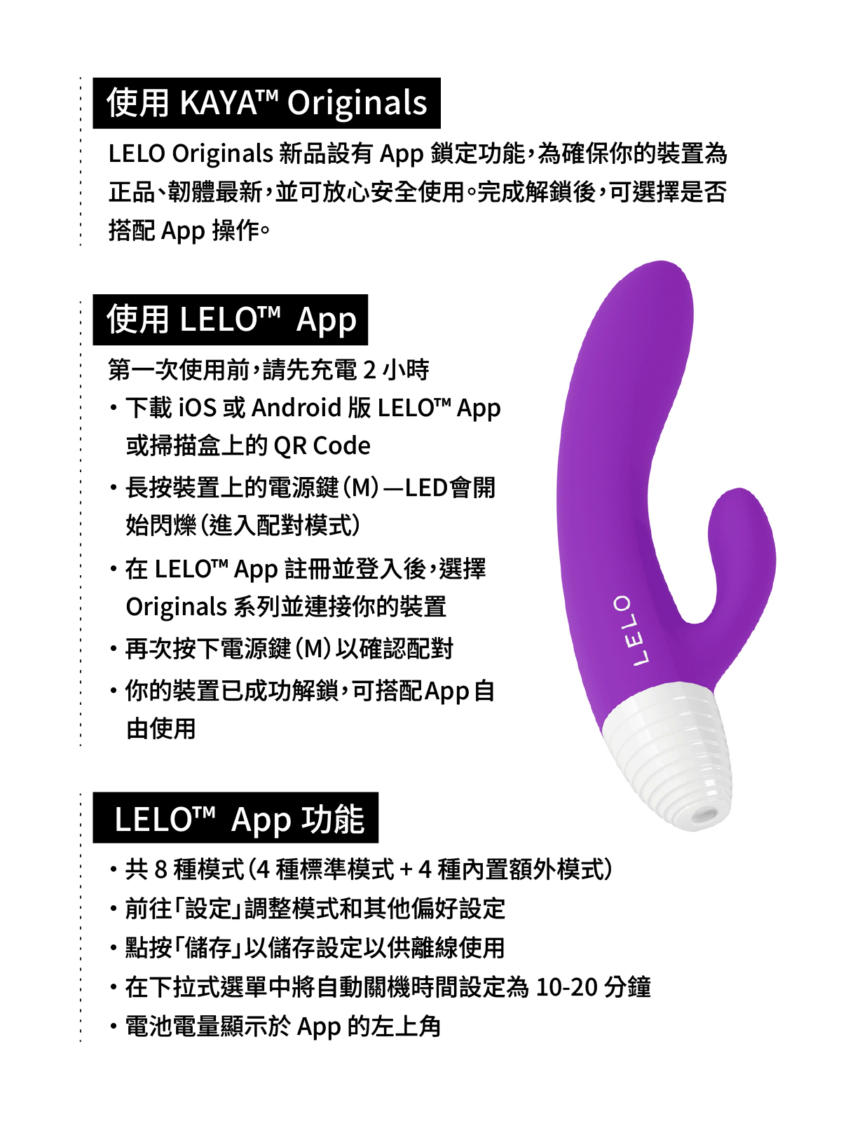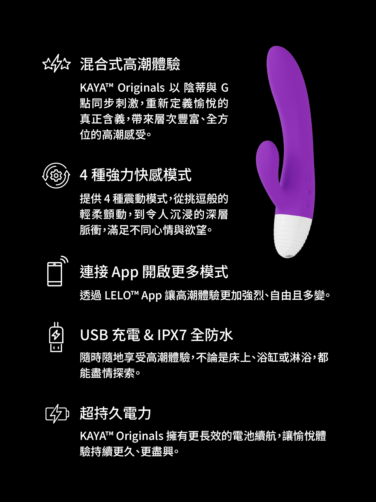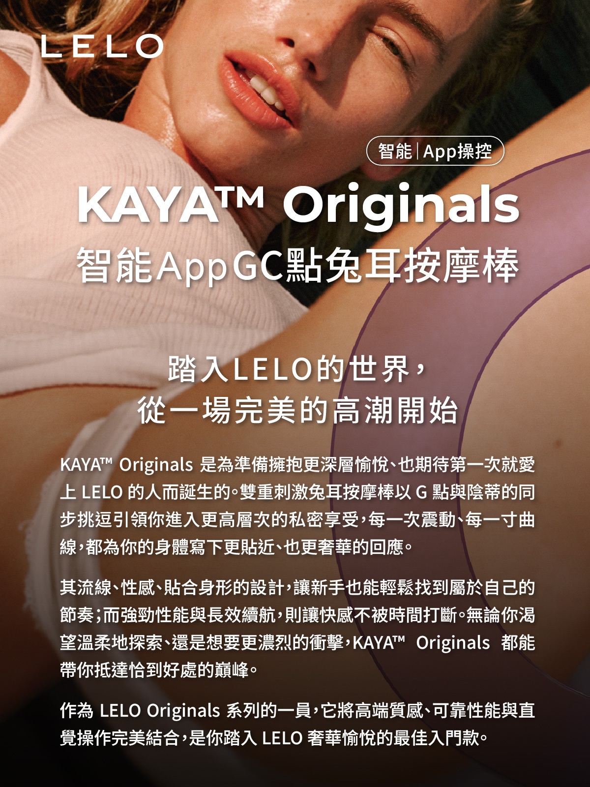 踏入 LELO 的世界,從一場完美的高潮開始 KAYA™ Originals 是為準備擁抱更深層愉悅、也期待第一次就愛上 LELO 的人而誕生的。雙重刺激兔耳按摩棒以 G 點與陰蒂的同步挑逗引領你進入更高層次的私密享受,每一次震動、每一寸曲線,都為你的身體寫下更貼近、也更奢華的回應。