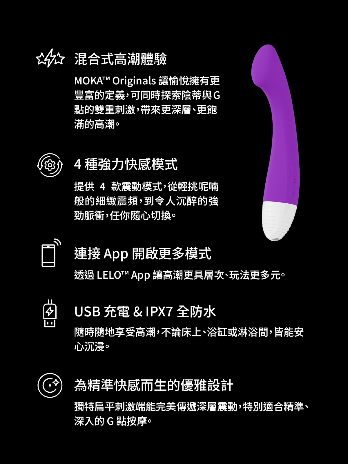 MOKA™ Originals 是 LELO Originals 系列中專為 G 點與外部刺激打造的精緻按摩棒,特別適合追求多樣玩法與細膩快感的使用者。纖細、優雅的弧形機身搭配扁平加寬的刺激端,能更精準地按壓 G 點、撫觸陰蒂,探索兩種感受,帶來更豐富的層次與高潮體驗。
