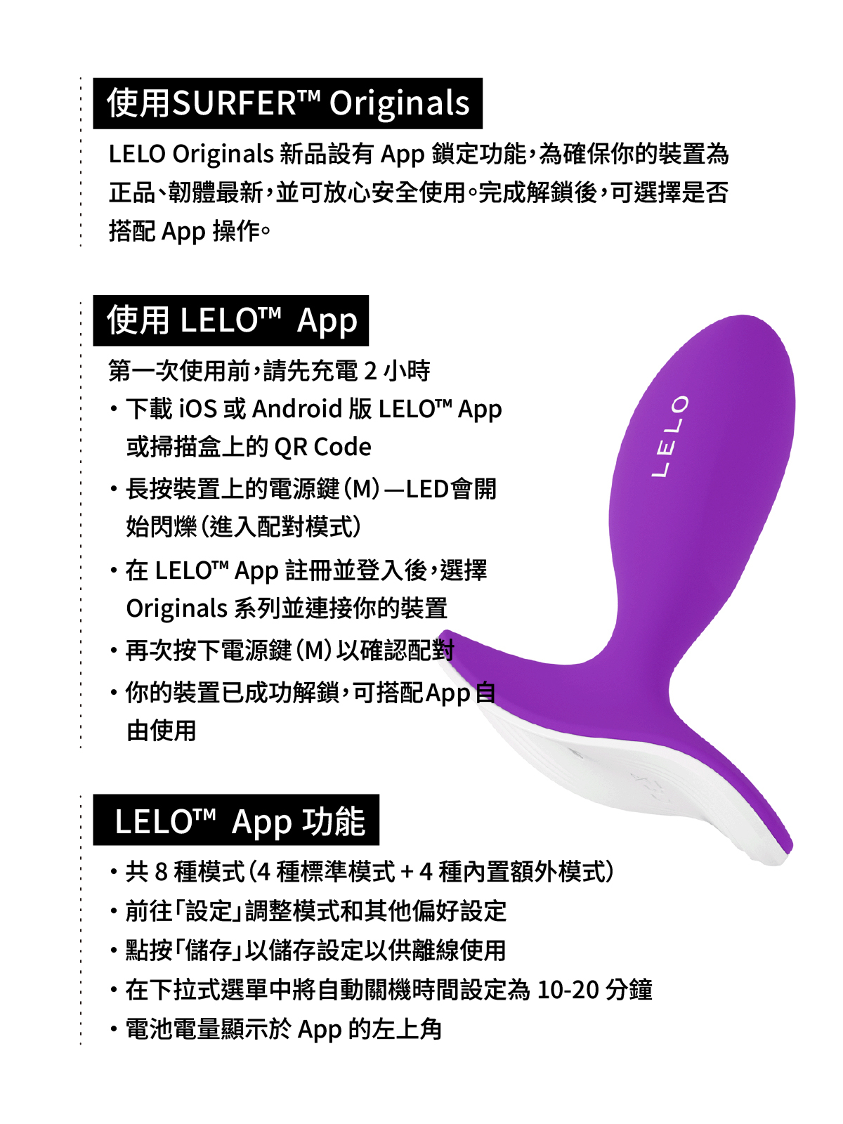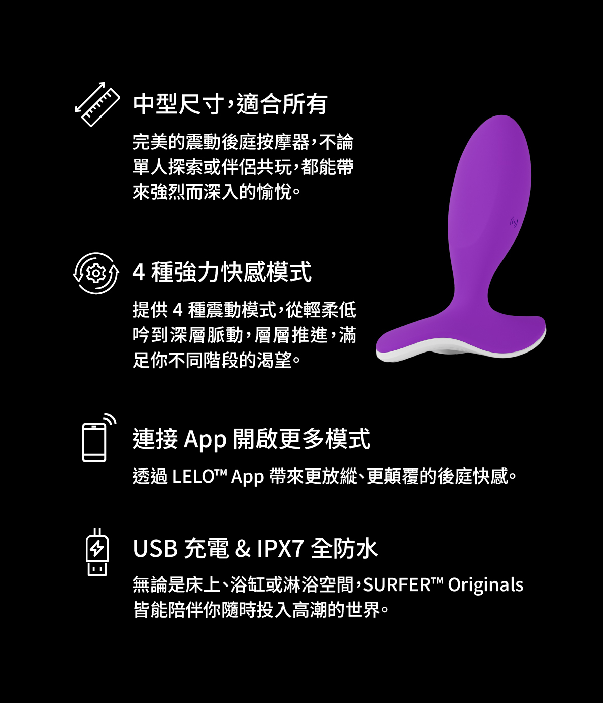 深層、精準、令人沉溺的悸動 SURFER™ Originals 是 LELO Originals 系列中專為後庭愉悅所打造的精緻按摩棒,以更深入、更集中的刺激,帶來富層次、卻細緻可控的高品質體驗。